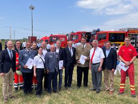Die Malteser, u.a. vertreten durch Landesgeschäftsführer Markus Schips und Katastrophenschutz-Referent Norbert Häger, freuten sich über die zugesagte Unterstützung Die Übergabe fand statt im Rahmen des Besuch der politischen Landesspitze beim „Tag der ehrenamtlichen Einsatzkräfte“ auf dem Landesfest in Pfungstadt.